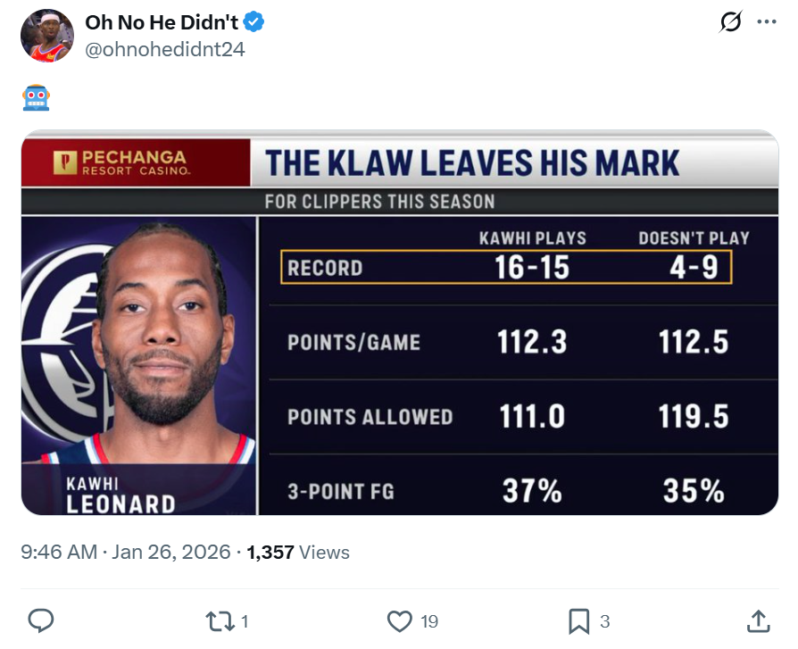 因此小卡是否出战影响巨大,当他出战时快船队17胜15负,但他缺席时战绩跌至4胜9负。